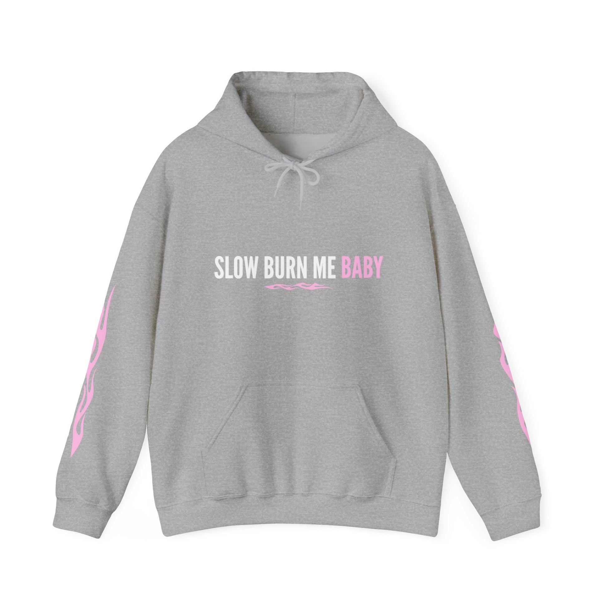 Introducing our Unisex Heavy Blend™ 'Slow Burn Me Baby' Hooded Sweatshirt, the ultimate cozy companion for every occasion. The vibrant design, featuring bold pink accents, adds a trendy edge that will make you stand out in any crowd. Perfect for those who appreciate unique fashion, this piece is suitable for anyone looking to express their personality through their clothing.